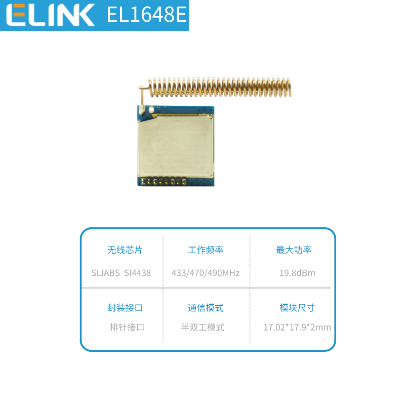 EL1648E是一款采用SI4438內(nèi)核設(shè)計(jì)的輸出功率為100mW的高性能無線收發(fā)通訊模組。工作頻段為425MHz~525MHz,默認(rèn)頻段490MHz。