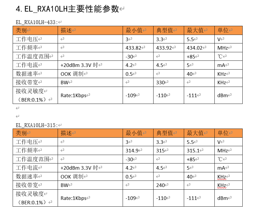 EL_RXA10LH是超低功耗、高靈敏度、遠(yuǎn)距離通訊、高性價比的OOK 射頻接收模塊,適用于ISM 頻段無線應(yīng)用。具有抗干擾性好、可靠性高的特點,即使在復(fù)雜干擾環(huán)境的情景使用,也不會對工作距離產(chǎn)生影響。該產(chǎn)品分為315MHz 和433.92MHz兩個工作頻率,支持0.5~40kbps 的數(shù)據(jù)率范圍,用戶只需要外加簡單的數(shù)據(jù)解碼電路,即可輕易實現(xiàn)無線產(chǎn)品的開發(fā)。主要應(yīng)用在遙控、家庭安全和告警、車庫和大門開啟、家庭自動化等。">