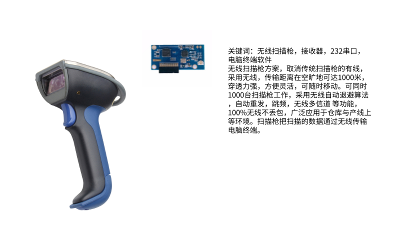 無(wú)線掃描槍方案,取消傳統(tǒng)掃描槍的有線,采用無(wú)線,傳輸距離在空曠地可達(dá)1000米,穿透力強(qiáng),方便靈活,可隨時(shí)移動(dòng)??赏瑫r(shí)1000臺(tái)掃描槍工作,采用無(wú)線自動(dòng)退避算法,自動(dòng)重發(fā),跳頻,無(wú)線多信道 等功能,100%無(wú)線不丟包,廣泛應(yīng)用于倉(cāng)庫(kù)與產(chǎn)線上等環(huán)境。掃描槍把掃描的數(shù)據(jù)通過(guò)無(wú)線傳輸電腦終端??蓙?lái)電定制功能。